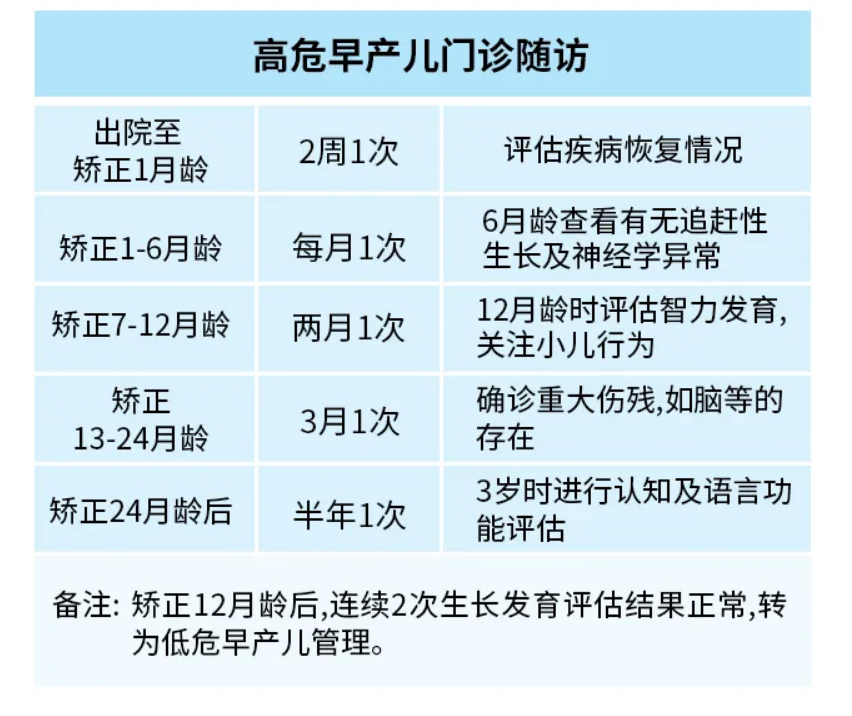 早產(chǎn)寶寶,尤其是高危早產(chǎn)兒定期至新生兒專業(yè)門診隨訪非常重要,包括對體格發(fā)育各項指標的監(jiān)測,神經(jīng)行為發(fā)育監(jiān)測,眼科及聽力的隨訪,各系統(tǒng)相關(guān)并發(fā)癥及發(fā)育障礙的識別和治療,同時為父母提供咨詢。
